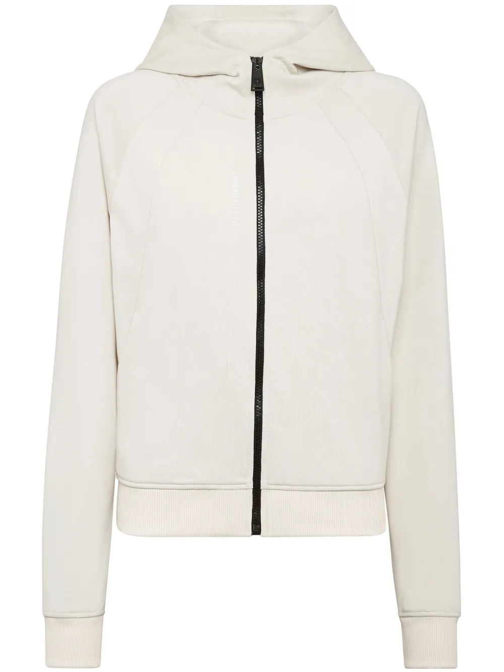 Écru, coton mélangé, logo imprimé sur le côté, capuche classique, fermeture zippée devant, manches longues, ourlet droit, poches latérales fendues.