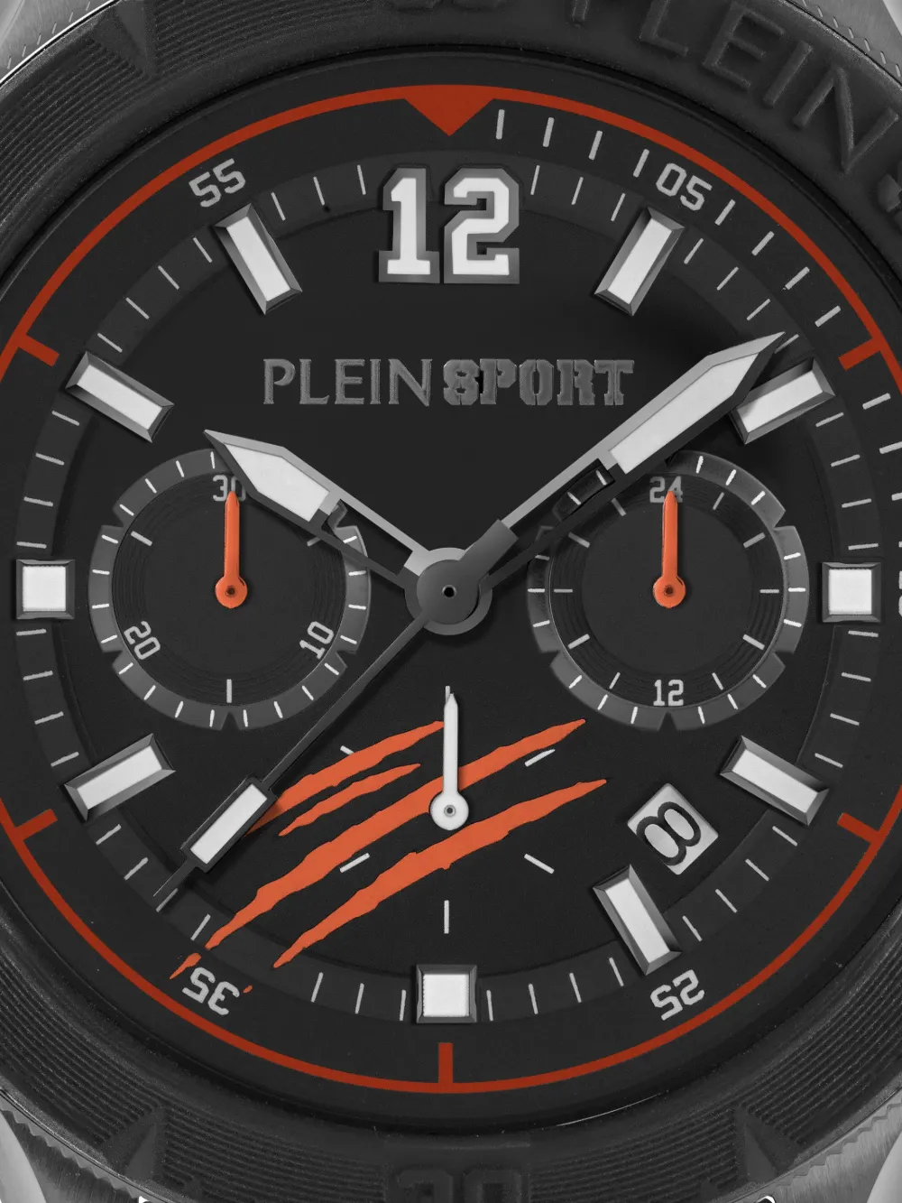 47.5mm roestvrij stalen horlogekast quartz uurwerk zwart Arabische wijzerplaat baton wijzerplaat baton wijzers stopwatchfunctie ronde wijzerplaat twee chronografische drukkers geschroefde kroon gegraveerde kast aan de achterkant zwart/fluorescerend oranje rubberen bandje gespsluiting datumaanduiding waterdichtheid tot 50 m/5 ATM Dit item wordt bezorgd met standaard twee jaar garantie van het merk.