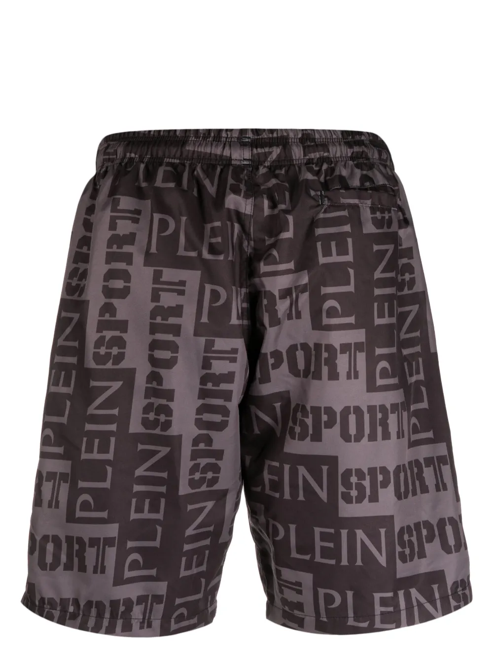 Donkergrijs, all-over logoprint, elastische tailleband met trekkoord en paspelzak aan de achterkant. Zwemkleding moet over je eigen kleding worden aangepast..