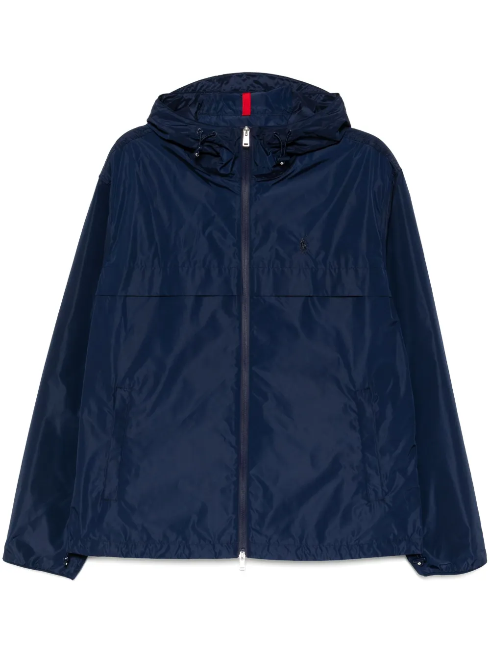 bleu marine fermeture zippée à double sens sur le devant capuche à lien de resserrage deux poches latérales zippées ourlet à lien de resserrage