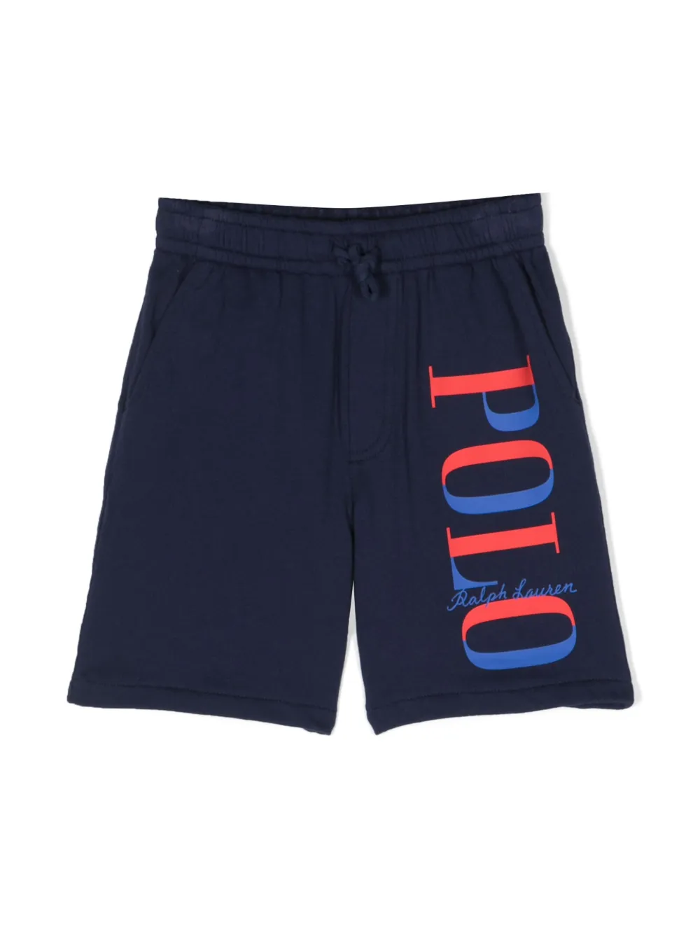 Bleu marine, coton, logo imprimé sur la cuisse, taille élastique à lien de resserrage, poche arrière passepoilée.
