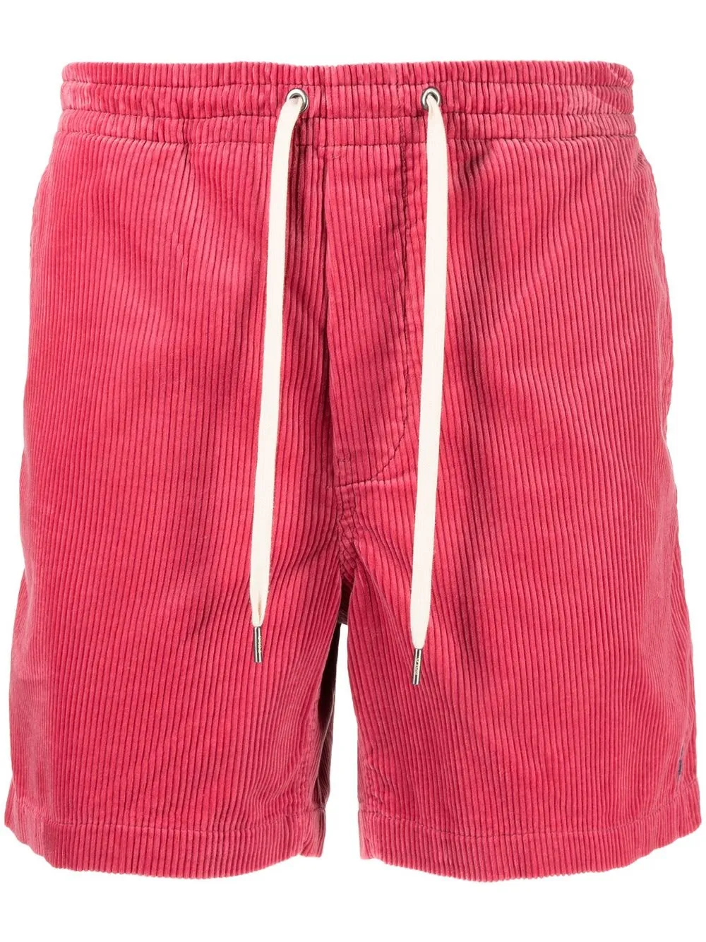 Rouge vif, coton, velours côtelé, lien de resserrage, deux poches latérales fendues, poches arrière passepoilées.