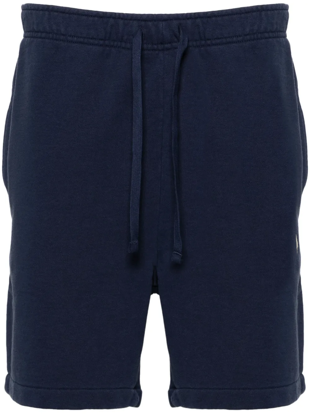 bleu marine coton texture jersey poches latérales fendues logo Polo Pony brodé sur la jambe longueur au dessus du genou poche arrière plaquée doublure French en éponge taille élastique à lien de resserrage