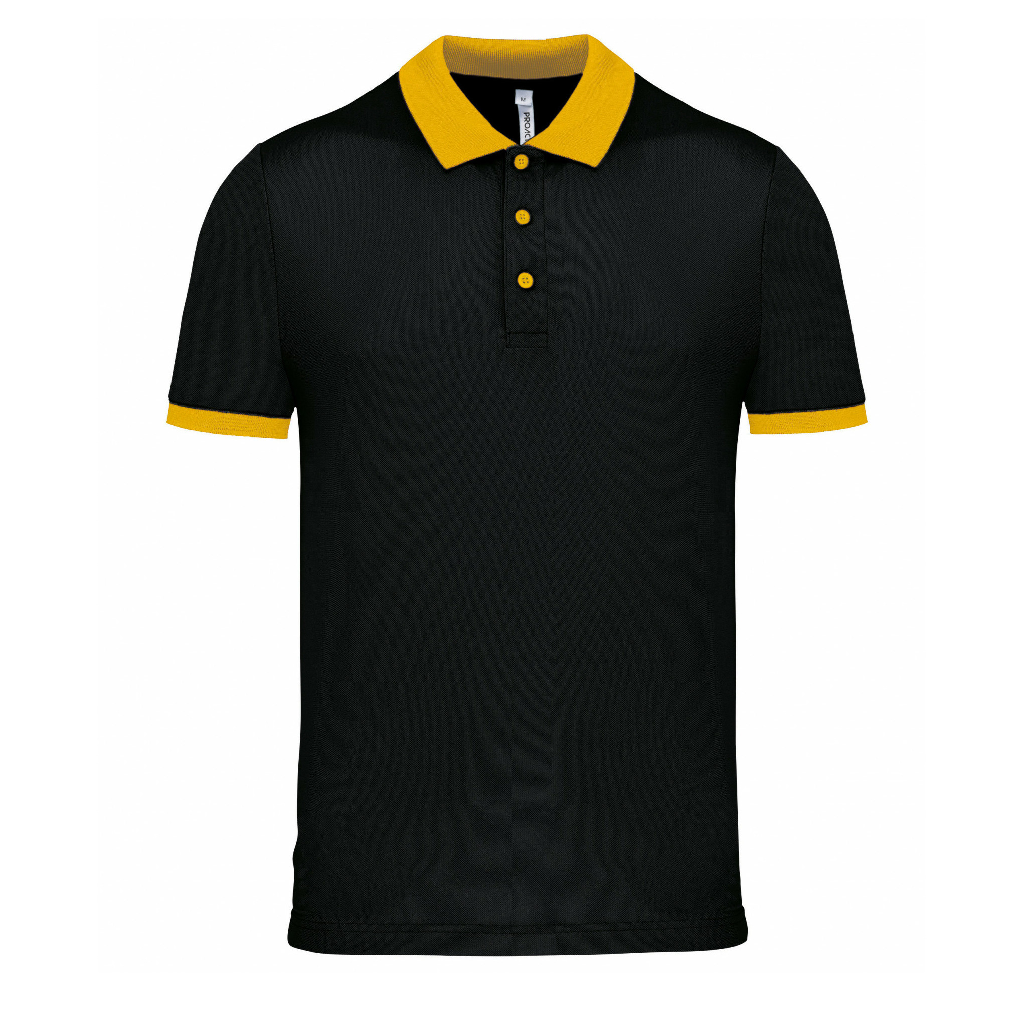 Heren poloshirt Sport Pro premium in de kleuren zwart/geel. Dit poloshirt is gemaakt van 100% interlock polyester stof en is heel sterk, licht en ademend. Het shirt heeft een premium topkwaliteit en een contrasterende kleur op de kraag en mouwen. 3-Knoops sluiting in de kraag. Merk: ProAct. Kwaliteit: 180 grams. High quality poloshirt voor op uw werk, sport of vrije tijds kleding. Blijft bijzonder goed in vorm na diverse wasbeurten.