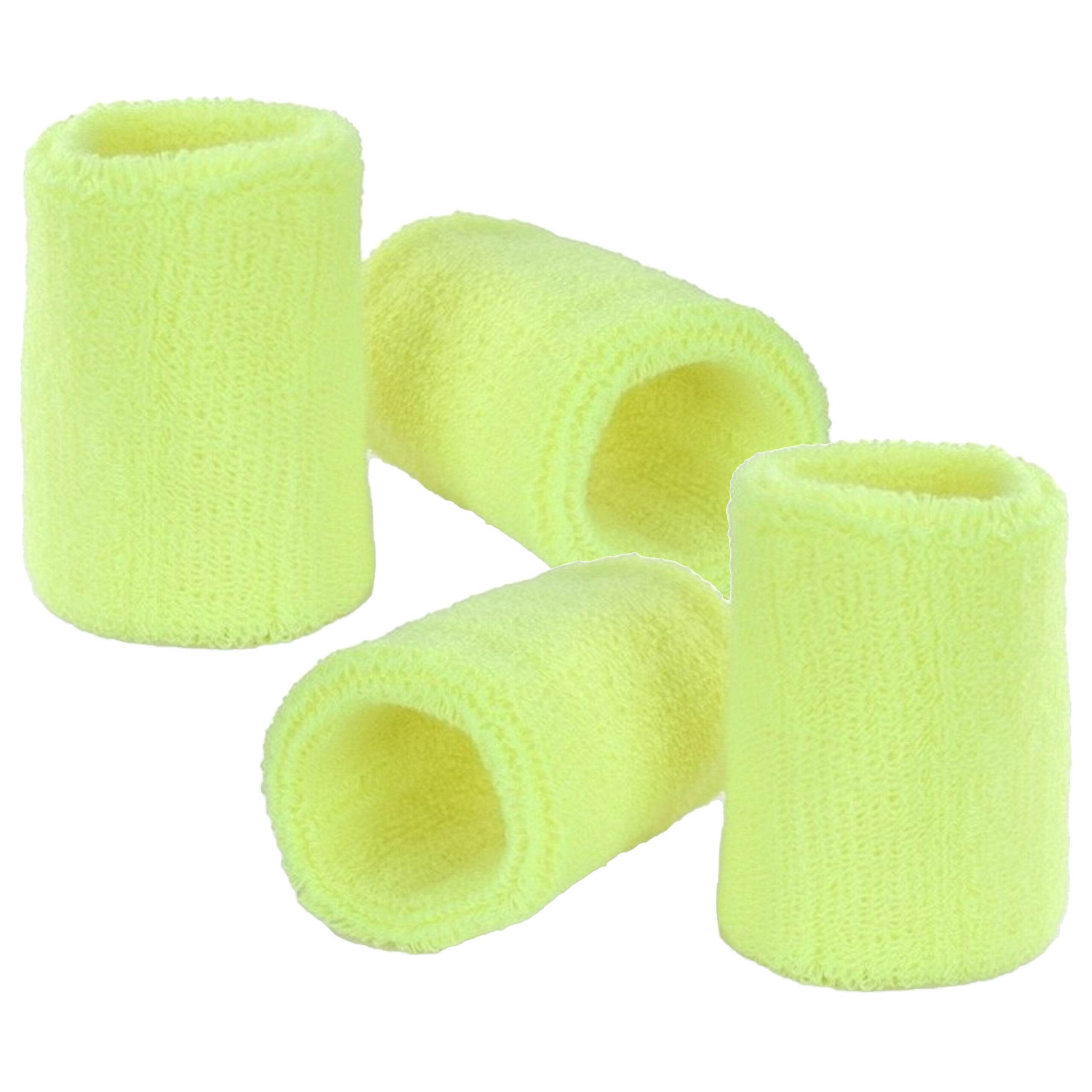 Pols zweetbandjes neon geel 4x stuks voor volwassenen. Set van fluoriserend geel gekleurde polsbandjes van badstof. Deze zweetbandjes voor om de pols zijn een perfect verkleed accessoire voor een 80’s thema carnavalsoutfit.