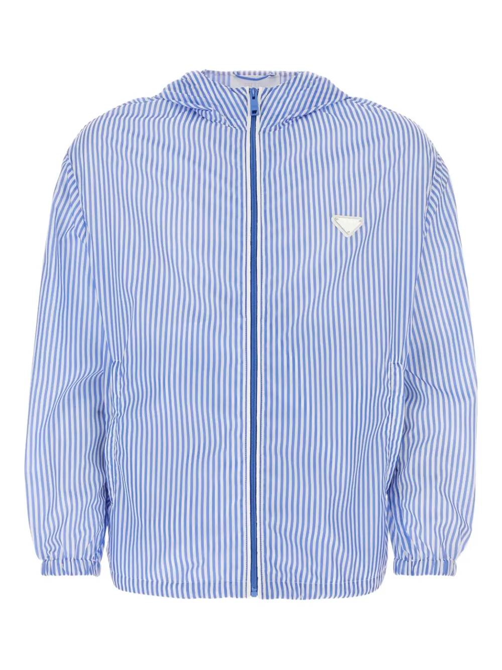 bleu clair rayures blanches fermeture zippée encolure à capuche manches longues poignets élastiqués