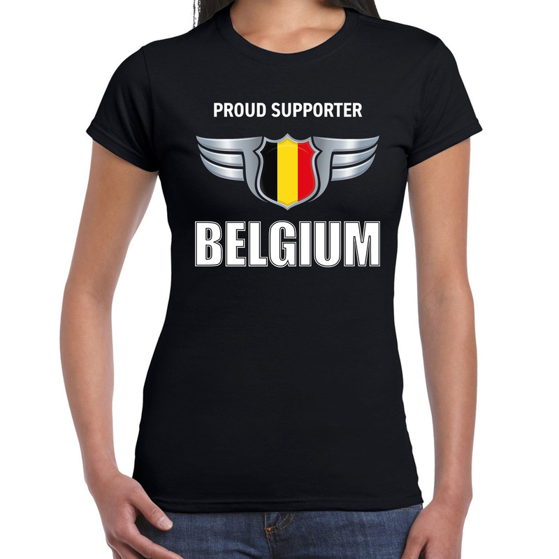 Proud supporter Belgium t-shirt zwart voor dames. Op dit zwarte Belgie landen shirt staat: Proud supporter Belgium. Het t-shirt met zilveren vleugels is leuk om cadeau te geven of om als supporter te dragen tijdens bijvoorbeeld het songfestival, de olympische spelen of het EK voetbal. Fan / supporter kleding.