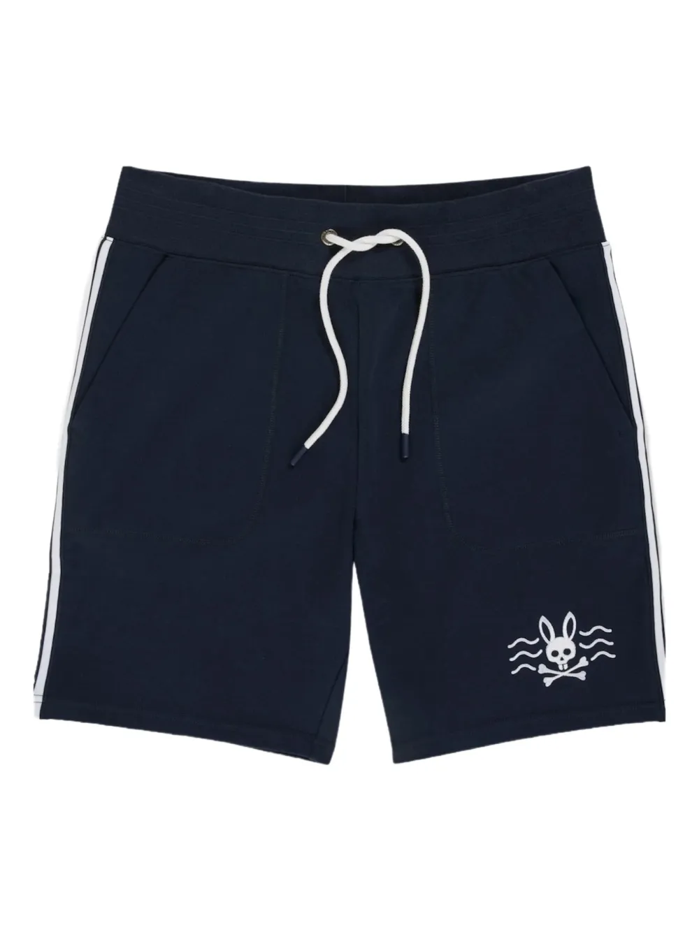 bleu marine lien de resserrage ceinture élastique poches latérales fendues rayures latérales logo imprimé sur le devant poche arrière passepoilée