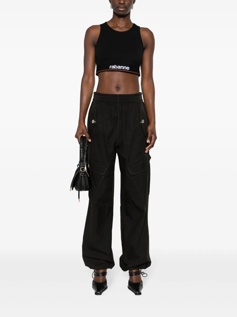 zwart stretch design ronde hals mouwloos elastisch detail met logoband cropped rechte zoom