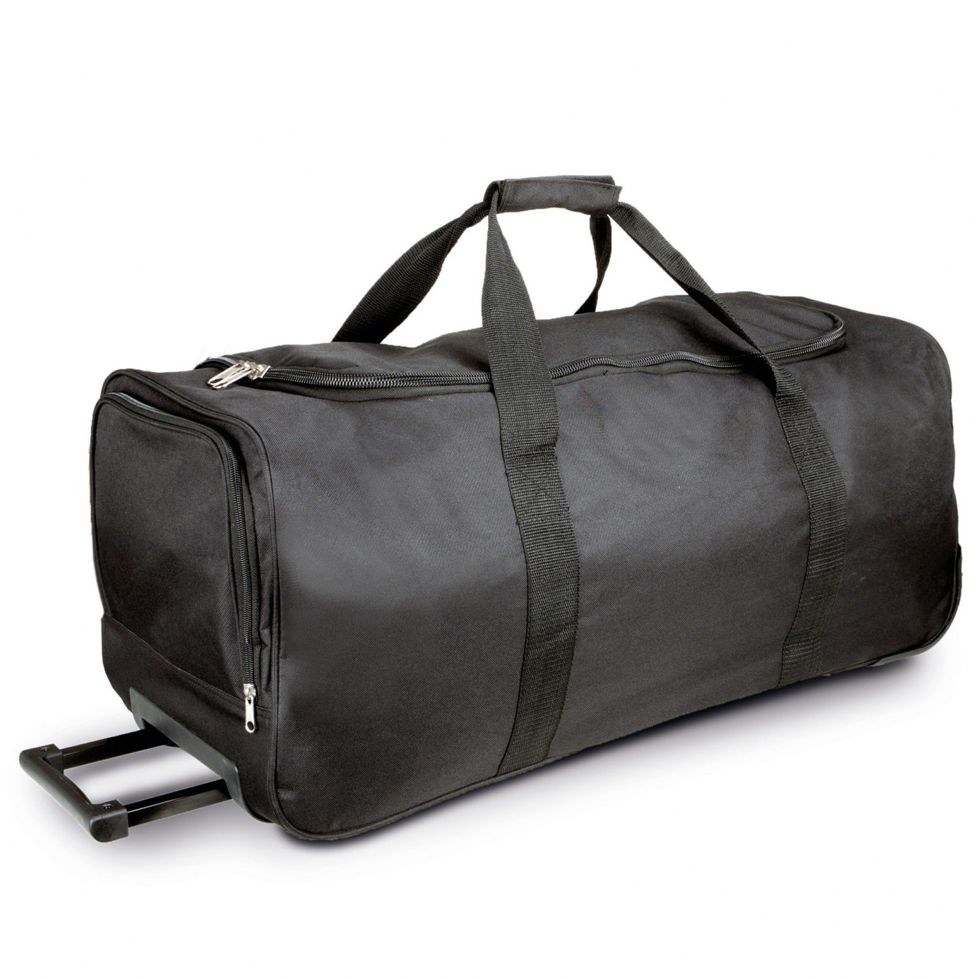 Weekendtas/reistas op wielen in de kleur Zwart van 66 liter. Deze grote tas beschikt over een groot hoofdvak met rits, een schoenenvak aan de zijkant, een uitschuifbaar handvat, wieltjes en verstevigde handvatten. Afmeting: ongeveer 71 x 31 x 30 cm. Inhoud: ongeveer 66 liter. Materiaal: 600D polyester.