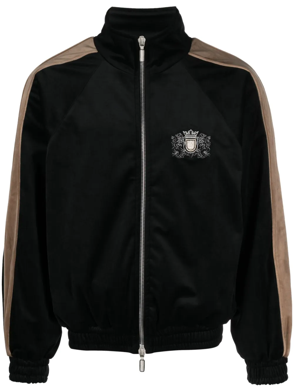 Noir, velours, design à empiècements colour block, motif héraldique, fermeture zippée à double sens sur le devant, manches longues, poignets élastiqués, deux poches passepoilées latérales, doublure intégrale, ourlet élastiqué.