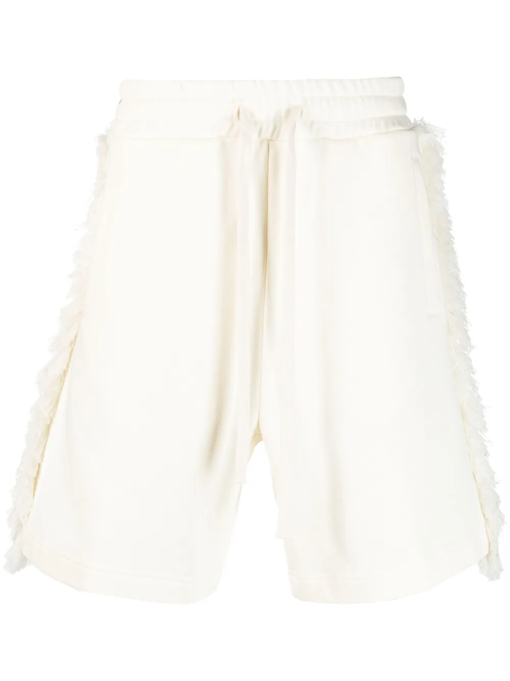 Blanc crème, coton, détails de franges, broderie zigzag, taille élastique à lien de resserrage, poche arrière passepoilée.