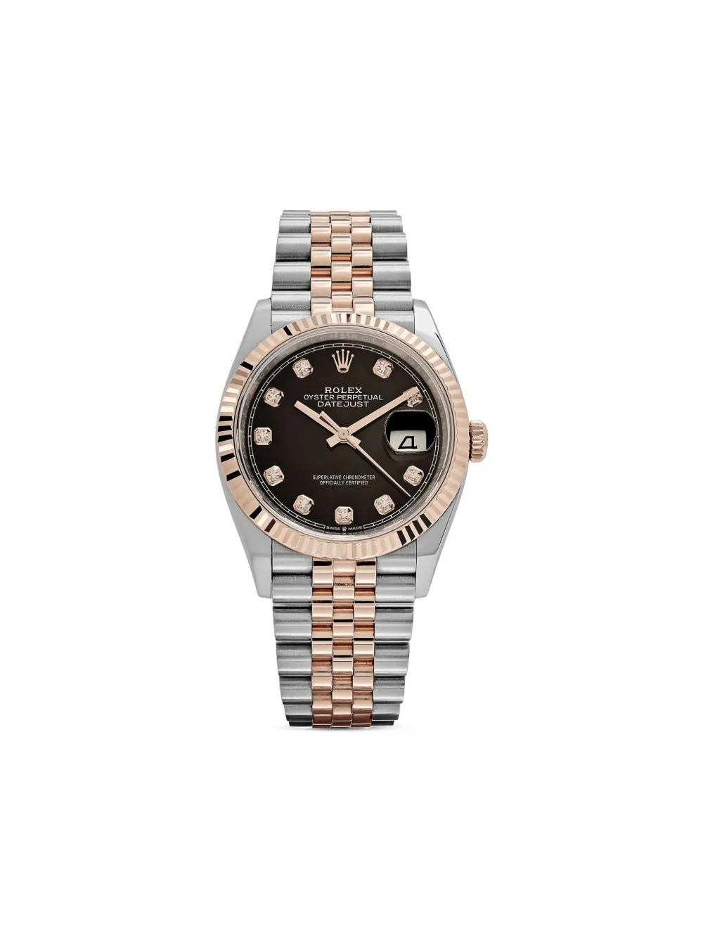 pre-owned 36 mm noir or rose 18ct/acier inoxydable boîtier rond lunette cannelée verre saphir cadran pavé de diamants heures, minutes et secondes centrales loupe Cyclope signature couronne vissée mouvement automatique bracelet Jubilee signature fermoir déployant Cette montre a été évaluée et authentifiée par les horlogers WRIST AFICIONADO. Boîte et documents originaux inclus. Cet article bénéficie d’un an de garantie standard proposé par la boutique partenaire. État : EXCELLENT. Cette article pre-owned est dans un état presque parfait et ne présente aucun signe d’usure.