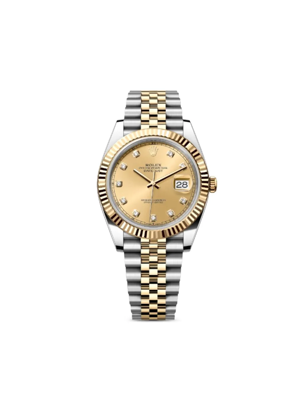 pre-owned 41 mm doré boîtier en acier inoxydable/or jaune boîtier rond lunette cannelée cadran géométrique cadran secondes aiguilles bâton aiguille seconde mouvement automatique suisse guichet de date grossissant loupe Cyclope signature couronne vissée bracelet bicolore Jubilee boucle déployante Boîte et documents originaux inclus. Cet article bénéficie d’un an de garantie standard proposé par la boutique partenaire. L’utilisation quotidienne normale et les agents externes peuvent réduire l’éclat des pierres précieuses et des surfaces en or. Pour entretenir vos bijoux, utilisez des produits spécifiques, non abrasifs et spécialement conçus pour le nettoyage.
