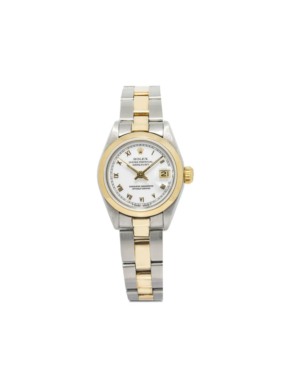 pre-owned 26mm blanc or jaune 18ct boîtier en acier inoxydable boîtier rond lunette fixe chiffres romains cadran secondes aiguilles bâton aiguille seconde mouvement automatique suisse guichet de date grossissant loupe Cyclope signature couronne vissée bracelet bicolore Oyster Perpetual boucle déployante Cet article bénéficie d’un an de garantie standard proposé par la boutique partenaire. L’utilisation quotidienne normale et les agents externes peuvent réduire l’éclat des pierres précieuses et des surfaces en or. Pour entretenir vos bijoux, utilisez des produits spécifiques, non abrasifs et spécialement conçus pour le nettoyage.