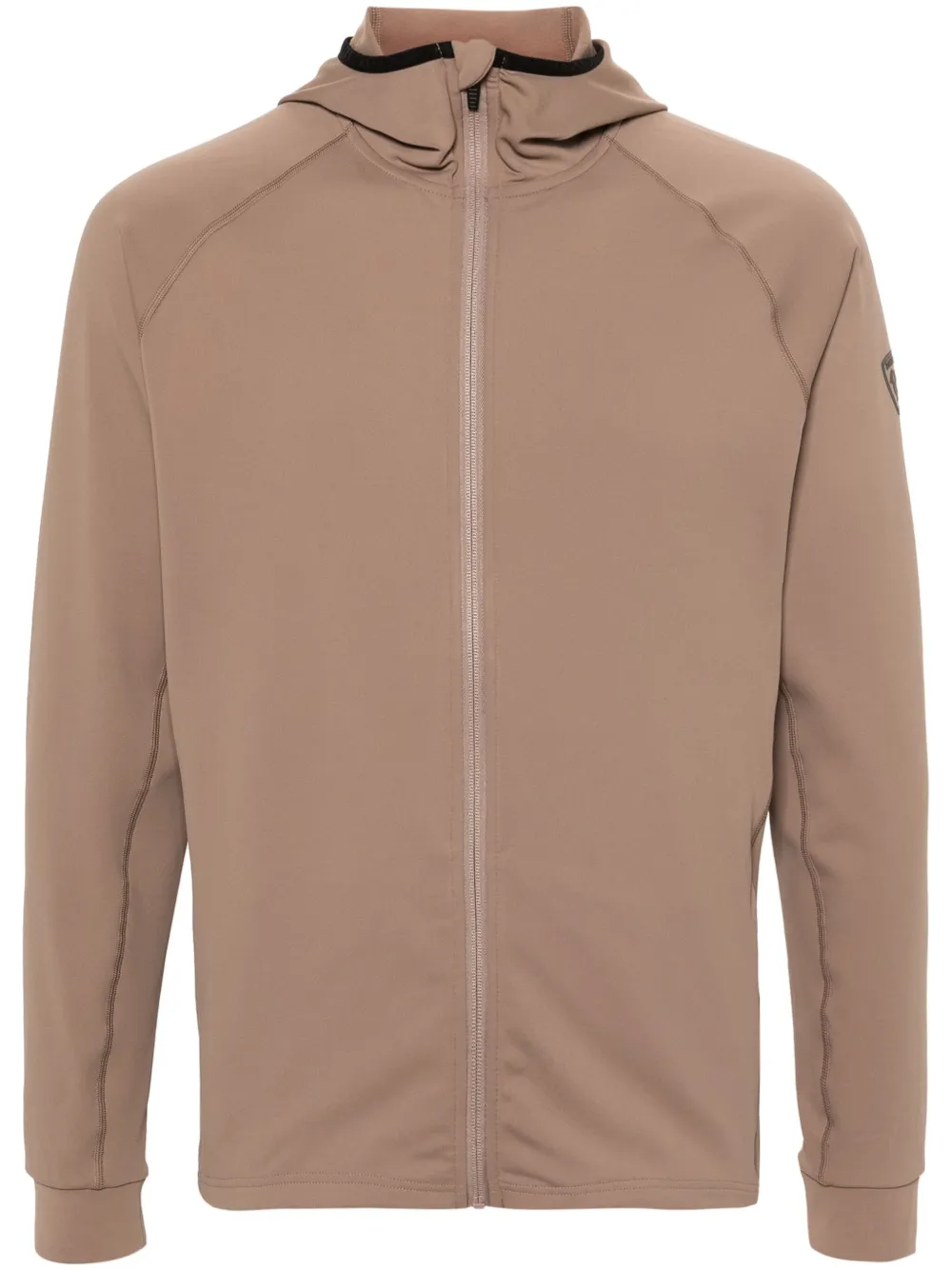 marron clair construction stretch tissu néoprene protection UV UPF 50+ anti-transpiration capuche classique col montant manches longues à poignets élastiqués logo imprimé sur la manche deux poches latérales zippées ourlet droit doublure en polaire fermeture zippée devant