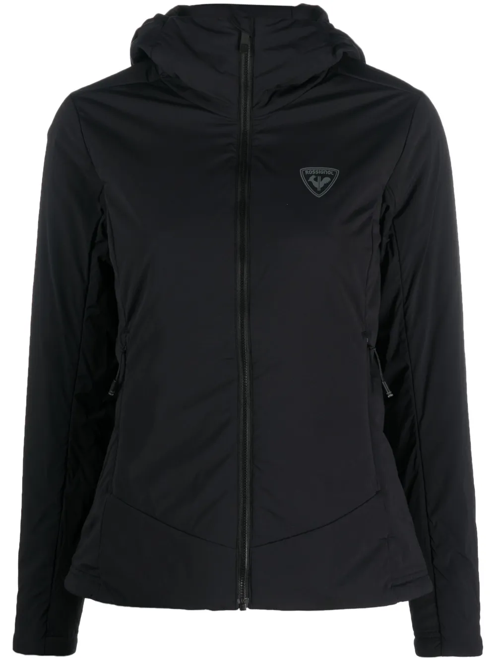noir structure légère revêtement imperméable logo imprimé à la poitrine capuche classique col montant fermeture zippée devant manches longues deux poches latérales zippées ourlet droit