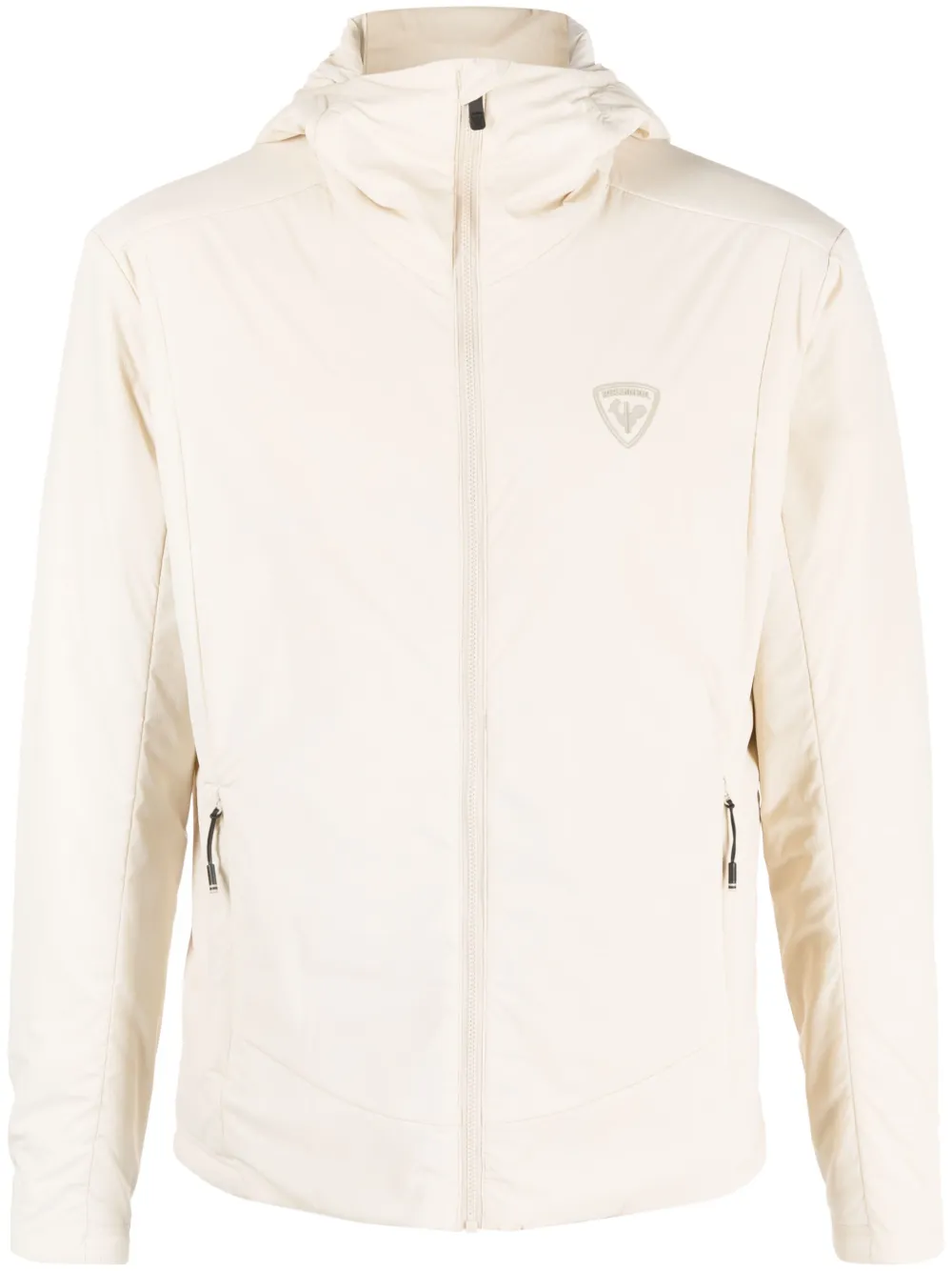 beige clair structure légère fini imperméable logo imprimé sur la poitrine capuche classique col montant fermeture zippée devant manches longues deux poches latérales zippées ourlet droit