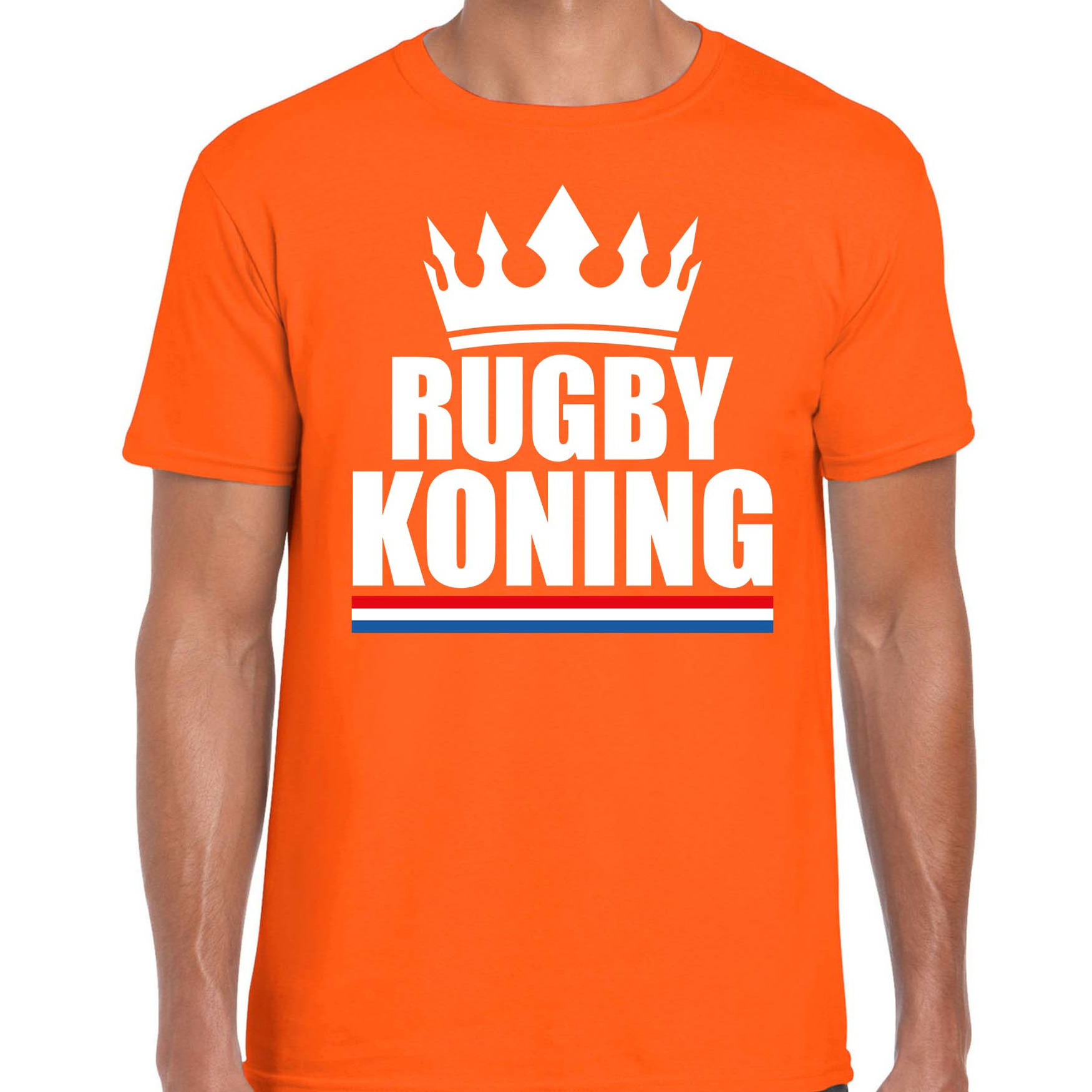 Rugby koning t-shirt oranje heren. Op dit shirt staat een grote kroon en de tekst: Rugby koning met Nederlandse vlag onder de tekst. Het t-shirt is leuk om te geven voor iemand ze verjaardag of om gewoon zelf te dragen, met rugbyen als sport en/of hobby! Materiaal: 150 grams, 100% katoen.