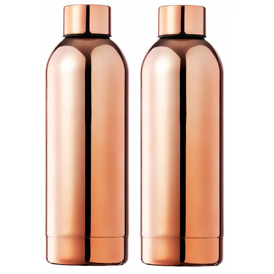 2x stuks RVS waterfles/drinkfles in de kleur metallic koper met veiligheid schroefdop 800 ml. Afmeting: ca. D7,5 x H22 cm. Inhoud: ca. 800 ml. Gewicht: ca. 175 gram. Materiaal fles: RVS. Geschikt voor magnetron: nee. Geschikt voor vaatwasser: nee. Geschikt voor vriezer: nee. Wordt geleverd in een mooie zwarte kartonnen cadeau doos.