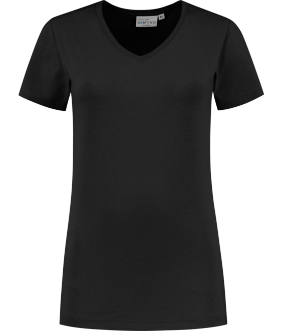 T-shirt, 50% gekamd katoen / 50% polyester, 180 gr/m², single jersey, ladies fit met korte mouwen, schouders voorzien van een dubbele laag stof voor extra versteviging en halve maan, V-hals met 1×1 ribboord en anti-microbiële afwerking. (Sport grey is melange: 85% gekamd katoen / 15% viscose).