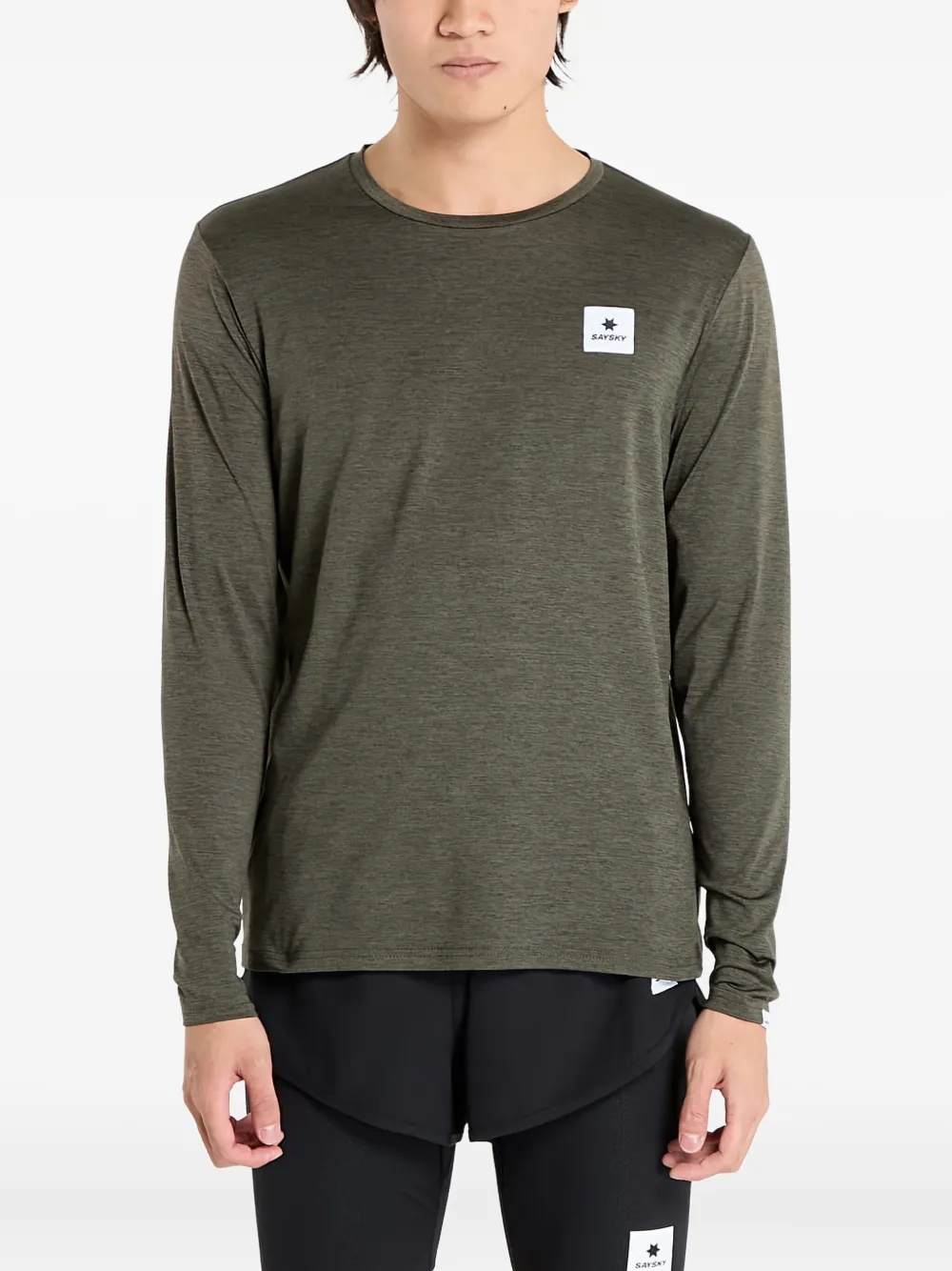 vert olive manches longues col rond patch logo texte imprimé à l’arrière