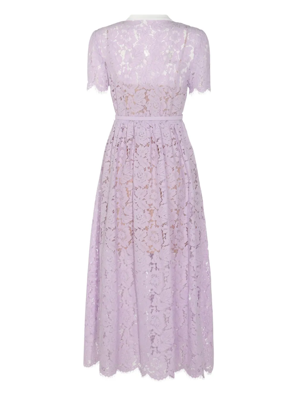 paars ronde hals knoopsluiting aan de voorkant korte mouwen geborduurd kant vier opgestikte zakken contrasterende kraag flared afwerking