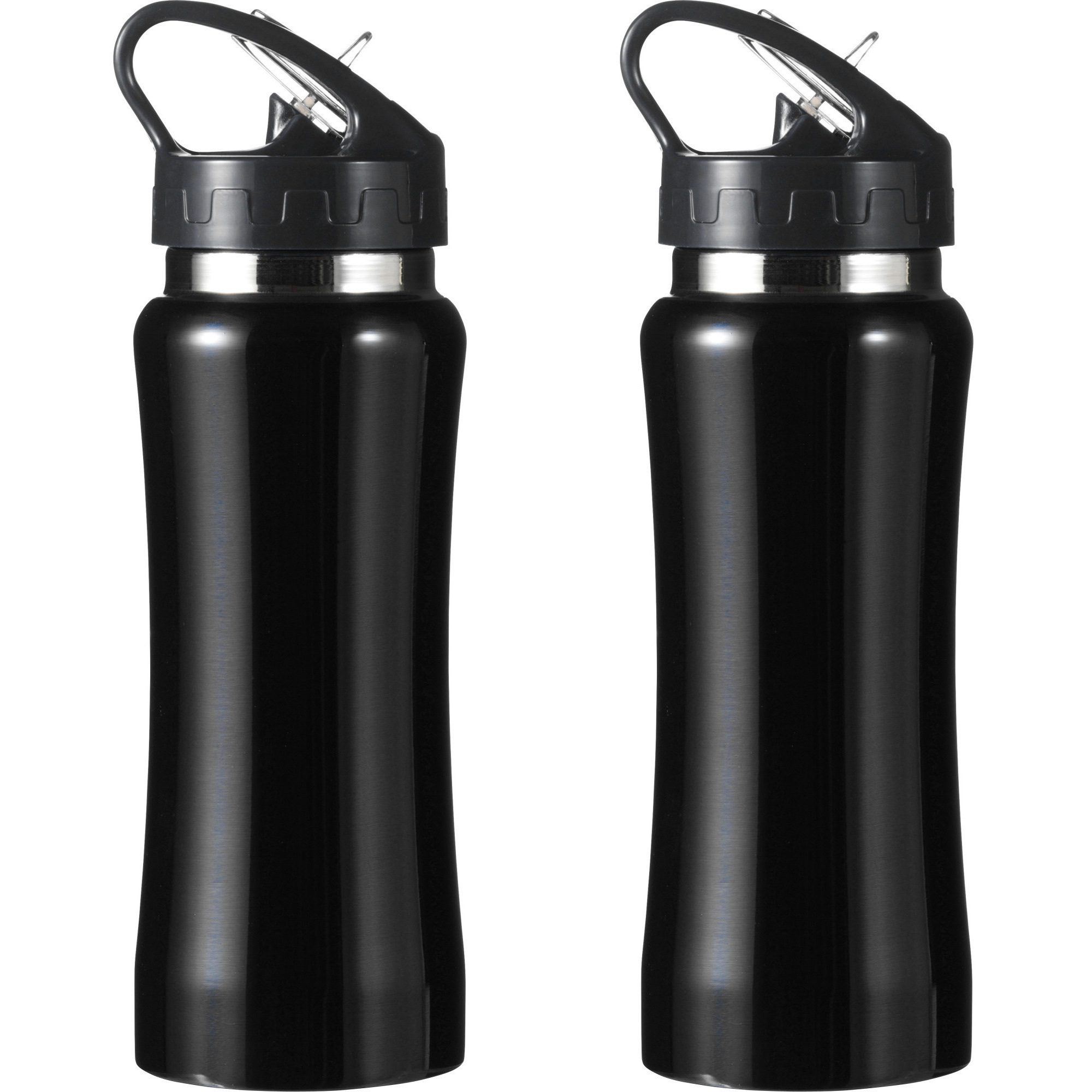Set van 2x stuks luxe hoge kwaliteit Bidon/drinkfles/waterfles 600 ml zwart van RVS. Eenvoudig openingsmechanisme en snelsluitingFormaat: 22.5 x 7 cm. Drinkflessen/waterflessen voor sport, recreatie of onderweg.