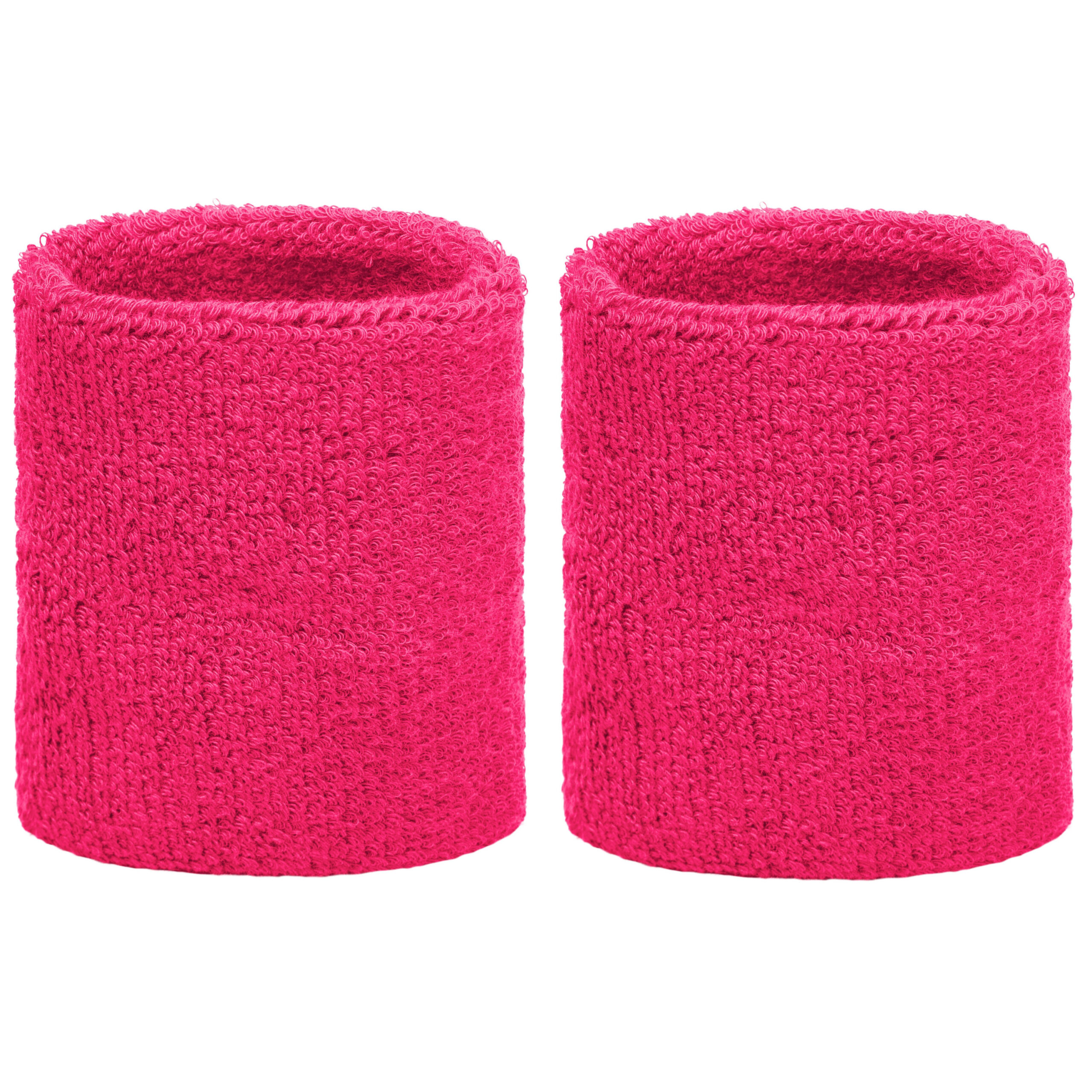 Set van 2x stuks sport/fitness zweetbandjes fuchsia roze voor om de pols. De zweetbandjes zijn 8 cm breed. Materiaal: 80% katoen en 20% elastan.