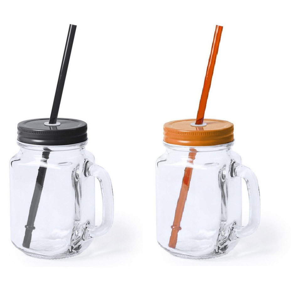 Set van 4x stuks Glazen Mason Jar drinkbekers/potjes met dop en rietje met een inhoud van 500 ml. Limonade, Fruit shakes of andere drankjes anti lekken drinkpotten bekers. Formaat ongeveer: 7,5 x 13,5 cm. Kleurencombinatie: 2x Zwart en 2x oranje. , Dit artikel bestaat uit:, 2x Mason Jar drinkbekers – glas – dop zwart met rietje – 500 ml – afsluitbaar – fruit shakes, 2x Mason Jar drinkbekers – glas – dop oranje met rietje – 500 ml – afsluitbaar – fruit shakes