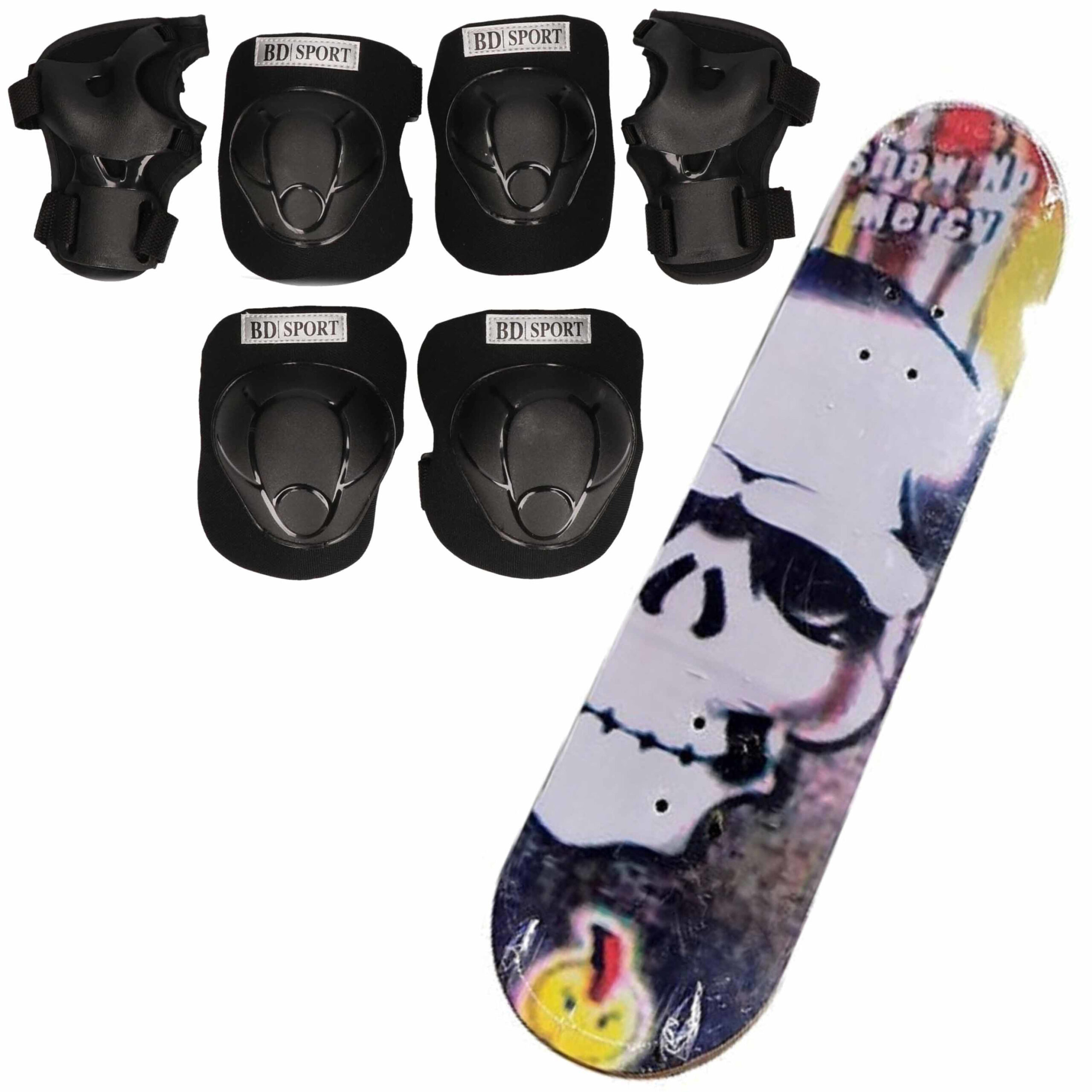 Set bestaande uit een zwarte beschermers set voor kinderen 4 tot 5 jaar en een skateboard met doodshoofd print. Complete valbescherming set, bestaande uit: polsbeschermers, elleboogbeschermers en kniebeschermers voor kinderen. De beschermers hebben elastische verstelbare banden die vastgemaakt kunnen worden met klittenband. Valbescherming voor tijdens het rolschaatsen/rollerskates/rollerskating/skateboarden/skaten/skeeleren of steppen. Wordt geleverd in een handig net met trekkoord, voor het gemakkelijk opbergen en meenemen van de set. Beschermers set in de maat S, doorgaans voor kinderen van 4 tot 5 jaar. Voor de juiste maat, raadpleeg het maatlabel in de afbeeldingen. Materiaal: kunststof, polyester. Kleur: zwart. Merk: Bellatio Design Sport. Sport/sporten valbeschermers – Beschermer – Beschermset voor jongens/meisjes/kinderen – Bescherming van polsen, ellebogen en knie?n.