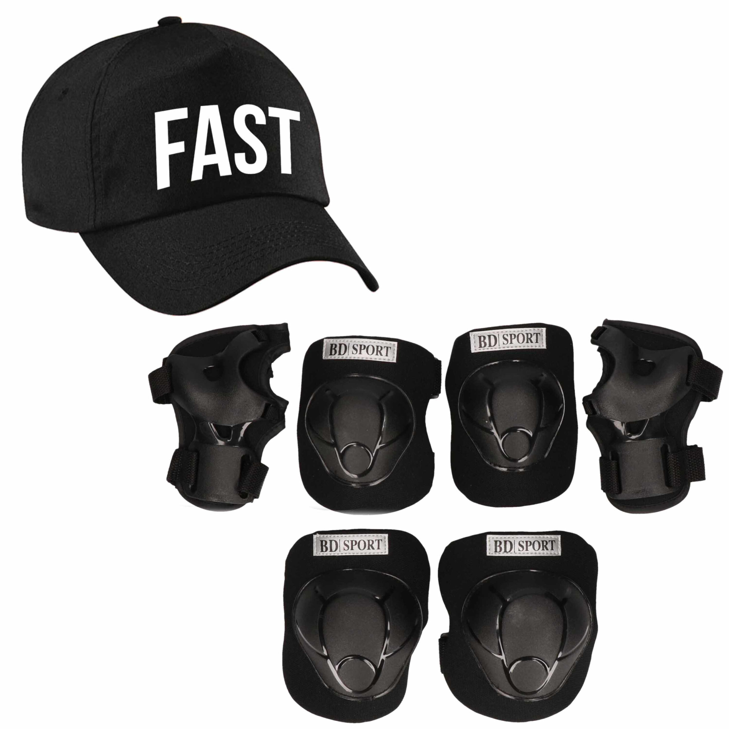 FAST pet zwart voor meisjes en jongens. Fast cap zwart voor stoere skaters. Op deze baseball cap staat in het wit de tekst: FAST. Materiaal: 65% polyester / 35% katoen. Klittenbandsluiting. , Dit artikel bestaat uit:, 1x Kniebeschermers / skate beschermset zwart voor kinderen maat L – 9 tot 10 jaar, 1x Fast pet zwart voor kinderen