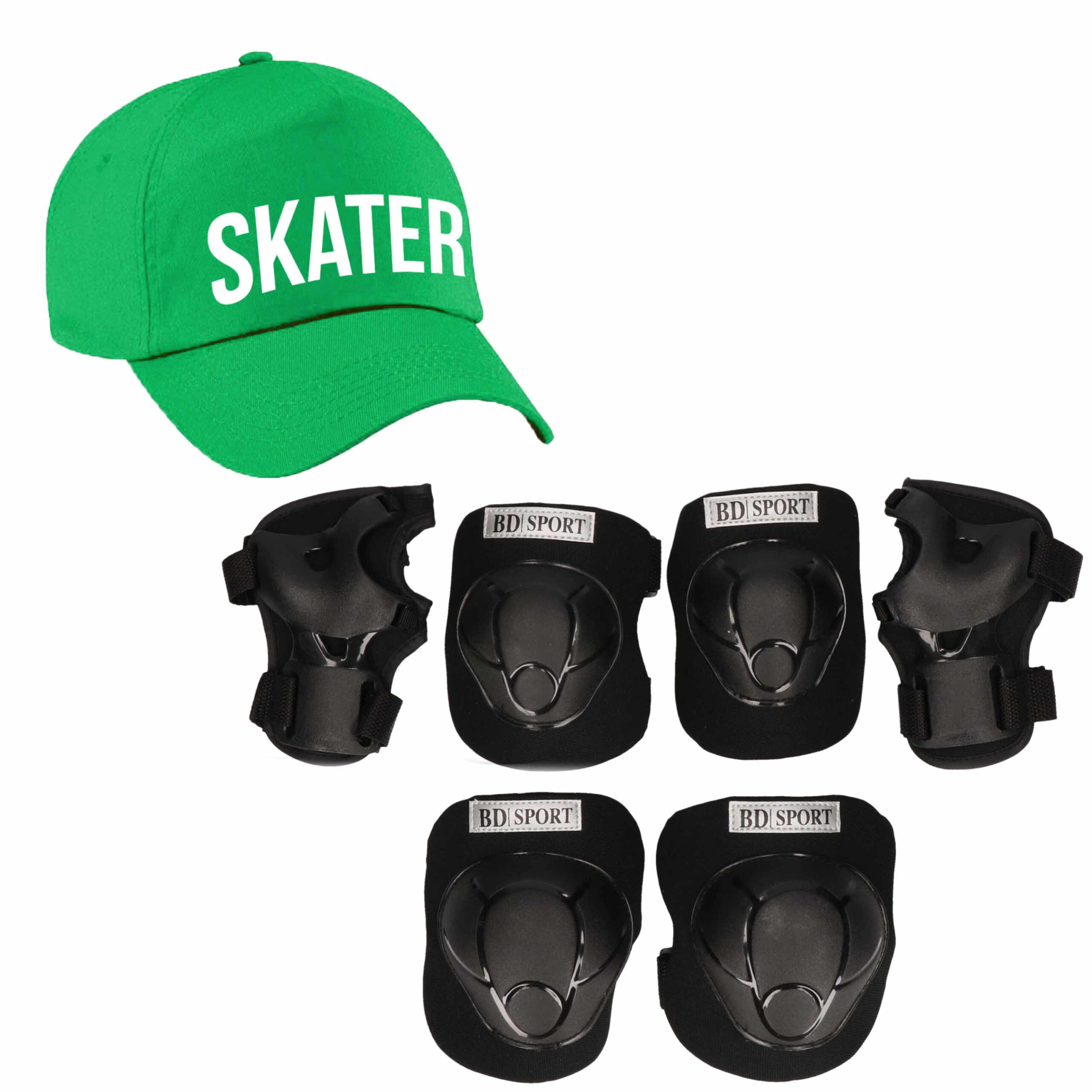 Skater pet groen voor meisjes en jongens. Stoere pet groen voor stoere skaters. Op deze baseball cap staat in het wit de tekst: SKATER. Materiaal: 65% polyester / 35% katoen. Klittenbandsluiting. , Dit artikel bestaat uit:, 1x Kniebeschermers / skate beschermset zwart voor kinderen maat L – 9 tot 10 jaar, 1x Skater pet groen voor kinderen