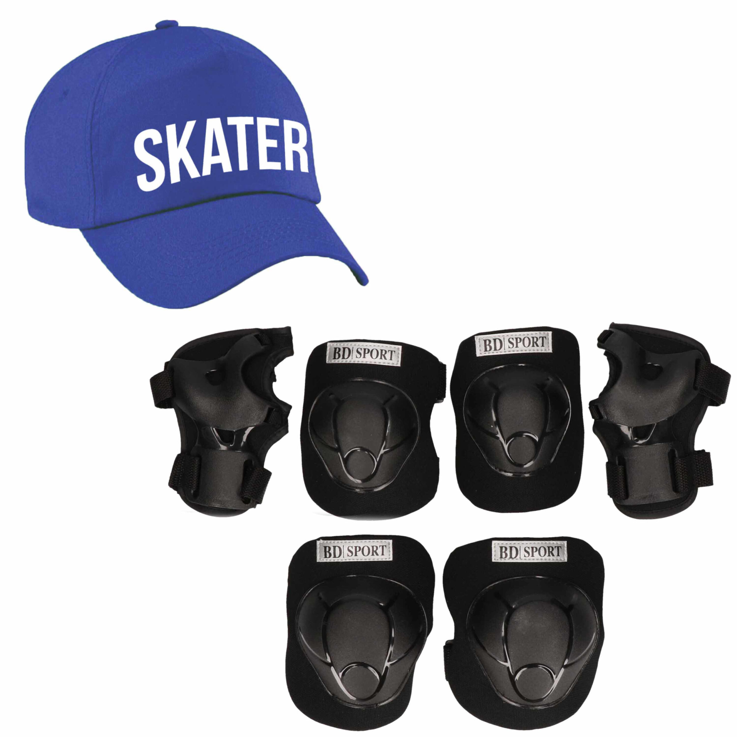 Set van valbescherming voor kinderen maat M / 6 tot 8 jaar met een stoere SKATER pet blauw. De set bestaat uit: Zwarte beschermers set voor kinderen. Complete valbescherming set, bestaande uit: polsbeschermers, elleboogbeschermers en kniebeschermers voor kinderen. De beschermers hebben elastische verstelbare banden die vastgemaakt kunnen worden met klittenband. Valbescherming voor tijdens het rolschaatsen/rollerskates/rollerskating/skateboarden/skaten/skeeleren of steppen. Wordt geleverd in een handig net met trekkoord, voor het gemakkelijk opbergen en meenemen van de set. Beschermers set in de maat M, doorgaans voor kinderen van 6 tot en met 8 jaar. Voor de juiste maat, raadpleeg het maatlabel in de afbeeldingen. Materiaal: kunststof, polyester. Kleur: zwart. Merk: Bellatio Design Sport. Sport/sporten valbeschermers – Beschermer – Beschermset voor jongens/meisjes/kinderen – Bescherming van polsen, ellebogen en knieen.