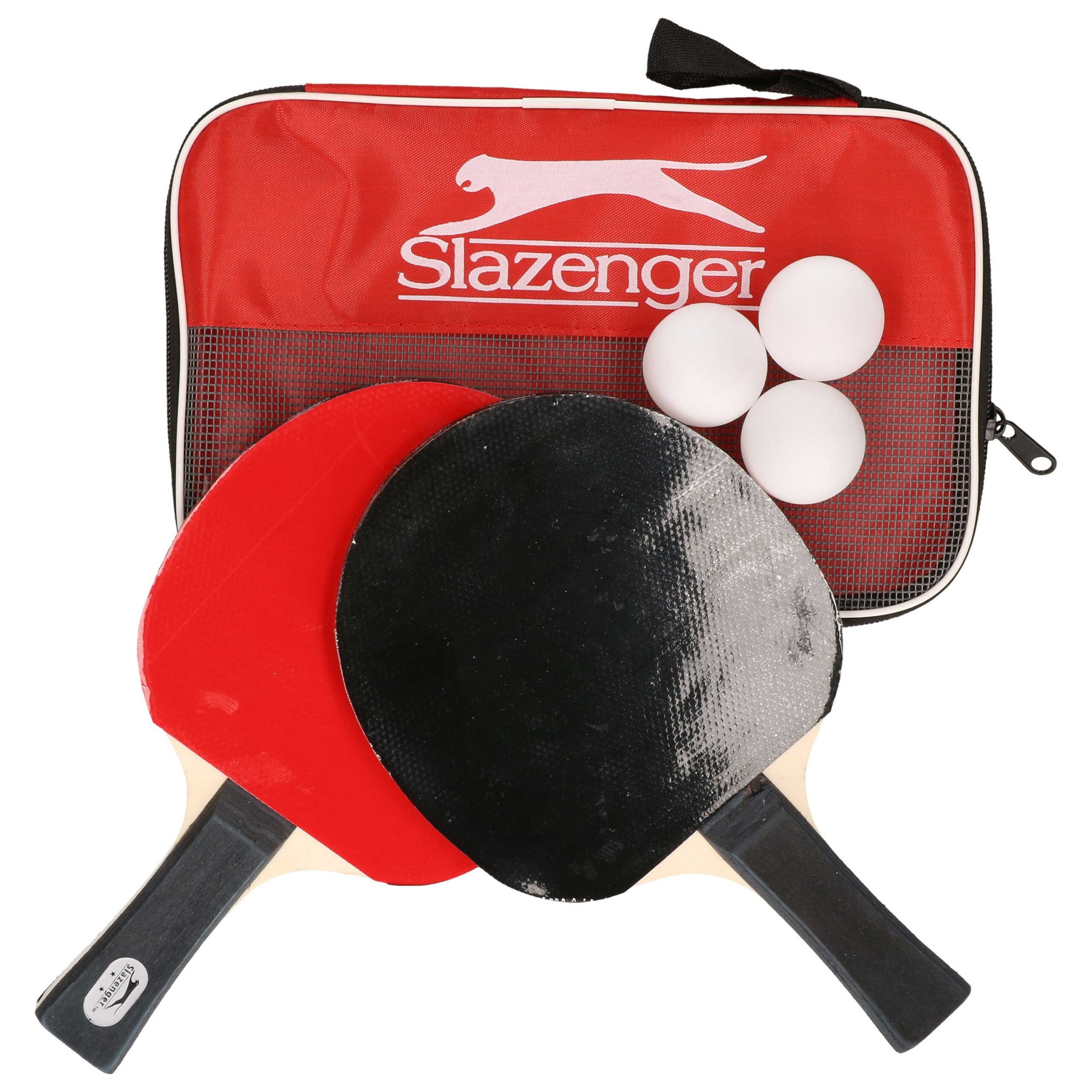 Merk: Slazenger. Materiaal: kunststof/rubber/hout. Inhoud: 2 batjes, 3 balletjes, 1 opbergtas. Formaat tas: 18 x 27 x 2,5 cm. Met rekbaar mesh (gaas) aan de voorzijde, waardoor de balletjes er in passen zonder te beschadigen/in te deuken.