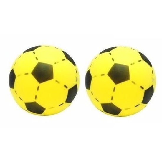 2x grote foam soft voetbal in de kleur geel. Grote softbal met voetbal print. Deze zachte speelgoed bal heeft een doorsnee van ongeveer 20 cm en is gemaakt van schuimrubber. Buiten en binnen speelgoed voor kinderen.