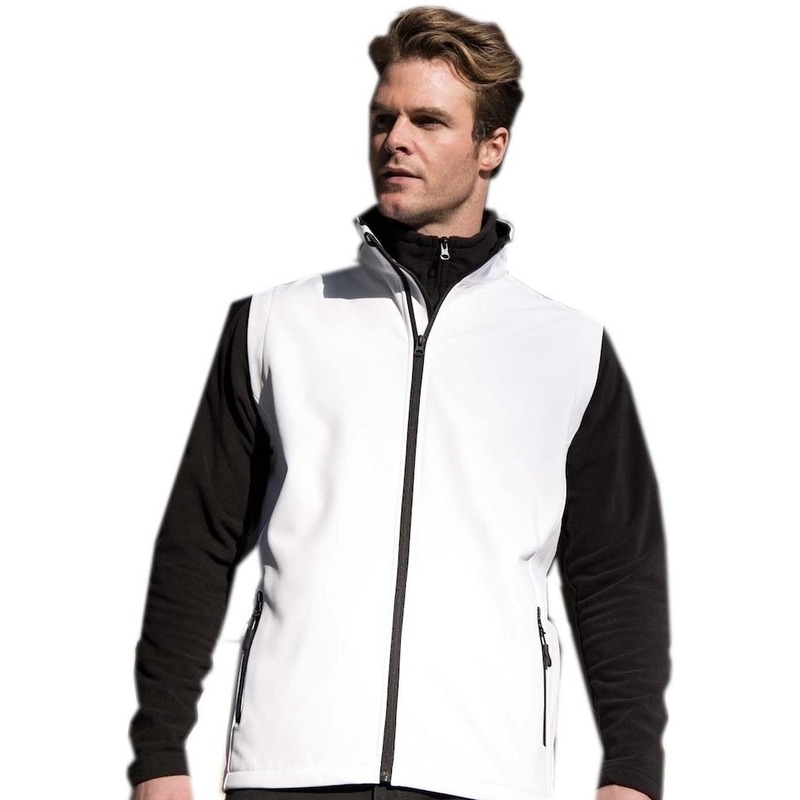 Softshell sport bodywarmer wit voor heren. Deze bodywarmer met opstaande kraag is voorzien van een ritssluiting aan de voorkant en twee steekzakken met rits. De boydwarmer heeft een microfleece binnenvoering voor extra warmte en comfort. Luchtdoorlatend en waterafstotend. Kwaliteit: 280 grams. Pasvorm: Slim-fit (getailleerd). Materiaal buitenkant: 100% polyester, binnenkant: 100% anti-pilling microfleece. Pasvorm: ruimvallend. Sport kleding voor o.a. hardlopen en zeilen.