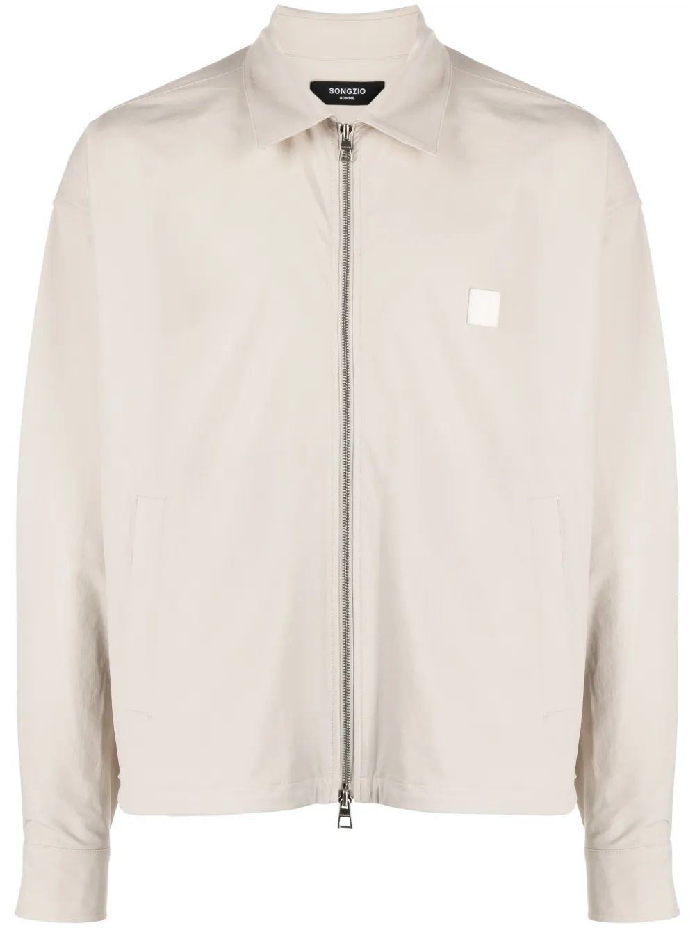 beige patch logo sur le devant col classique épaules tombantes manches longues poignets boutonnés fermeture zippée à double sens ourlet droit