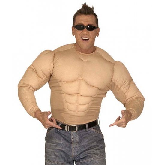 Spierballen shirt heren, model Rambo. Transformeer jezelf in een echte bodybuilder met dit stoere spierballen shirt voor heren. Dit polyester muscle shirt is zacht, soepel en opgevuld met kussentjes die je het uiterlijk geven van een afgetraind lichaam. Ideaal voor verkleedfeesten, themafeesten of carnaval, dit shirt geeft je het gespierde uiterlijk waar velen van dromen.