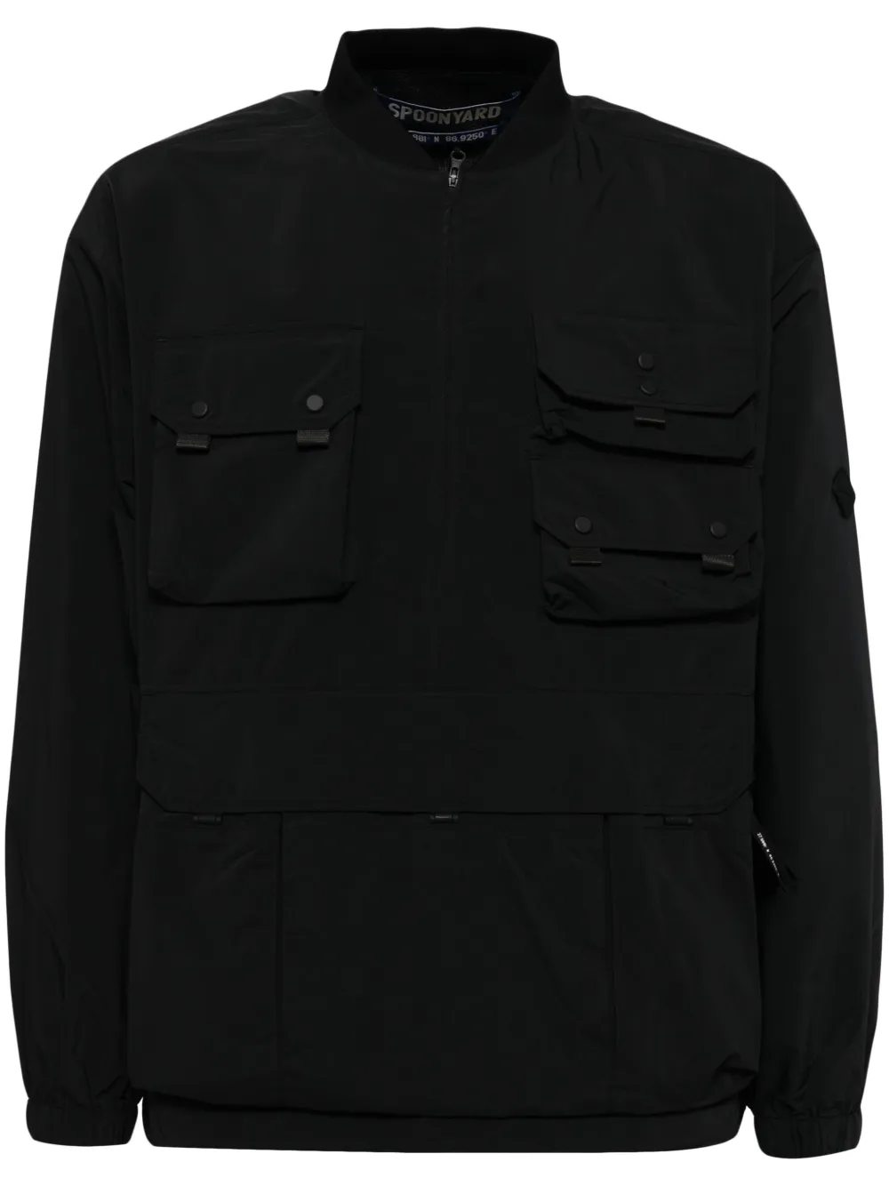 noir fermeture semi-zippée sur le devant trois poches poitrine à rabat poches devant à rabat poches latérales zippées col nervuré manches longues poignets élastiqués patch logo sur l’arrière fente à l’arrière détail de plis ourlet à lien de resserrage coupe droite Lorsque vous passez commande, veillez à prendre en compte que les mensurations indiquées pour cet article unisexe correspondent à la taille homme.