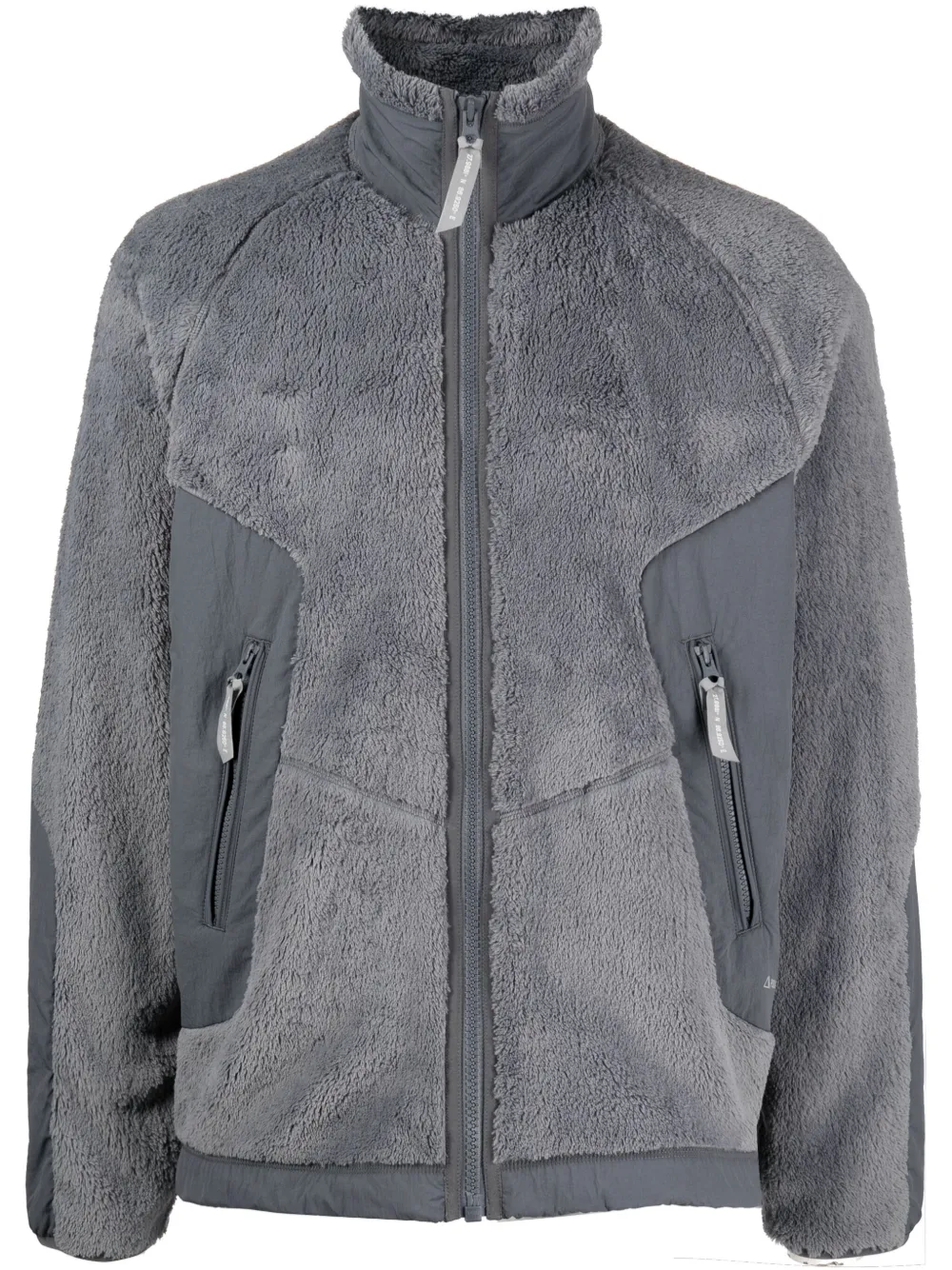 Gris perle, texture polaire, design à empiècements, patch logo sur l’arrière, col montant, fermeture zippée devant, manches longues raglan, deux poches latérales zippées.