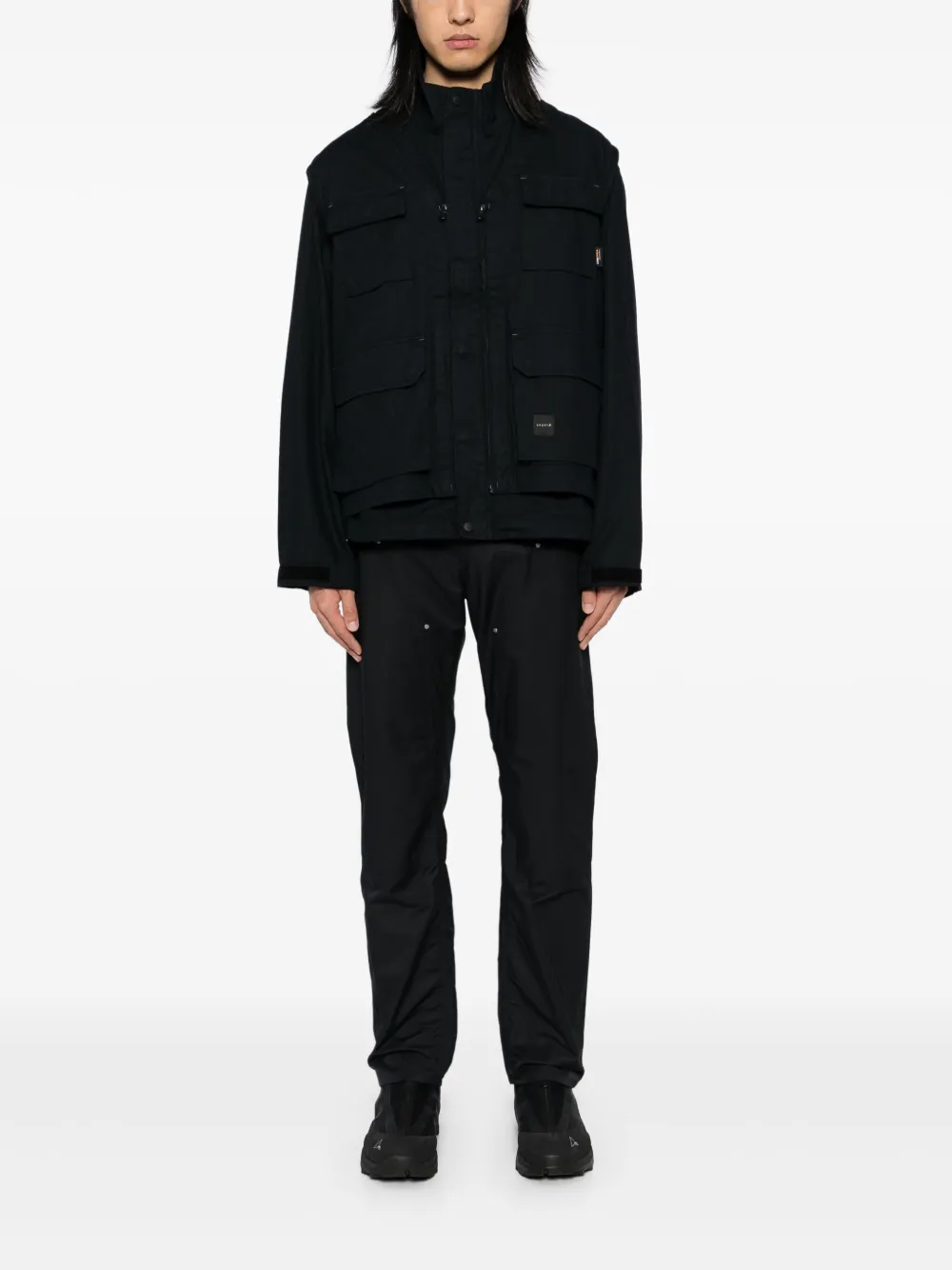 zwart katoenblend drukknoopsluiting en rits aan de voorkant vier klepzakken aan de voorkant logopatch aan de voorkant afneembare vlakken twee paspelzakken aan de zijkant lange mouwen volledige voering
