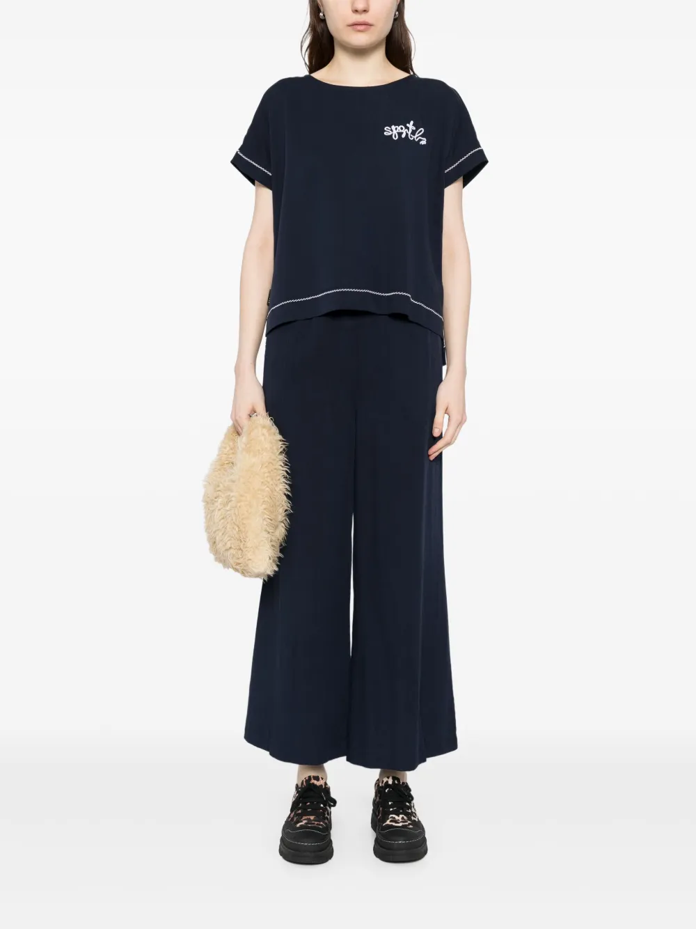 marineblauw elastische tailleband met trekkoord twee ingenaaide zijzakken wijde pijpen
