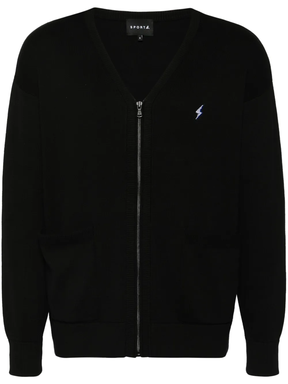 noir coton fermeture zippée devant col v manches longues poignets nervurés logo brodé deux poches plaquées avant patch logo sur le côté ourlet nervuré