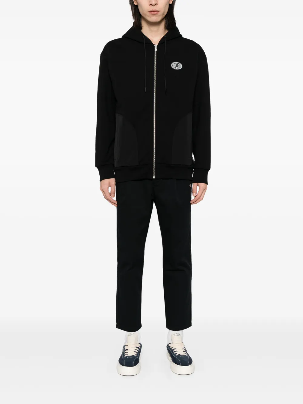 zwart katoen knoop- en ritssluiting aan de voorkant elastische tailleband riemlussen twee steekzakken aan de zijkant zilverkleurig logoplakkaat twee opgestikte achterzakken logopatch aan de achterkant toelopende pijpen