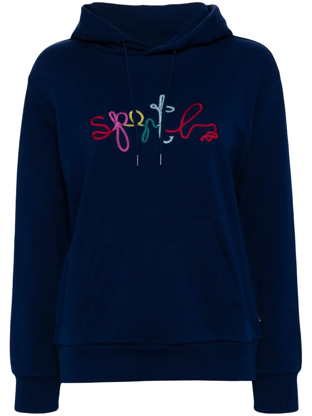 bleu coton logo brodé sur le devant capuche à lien de resserrage poche plaquée devant manches longues ourlet et bords nervurés