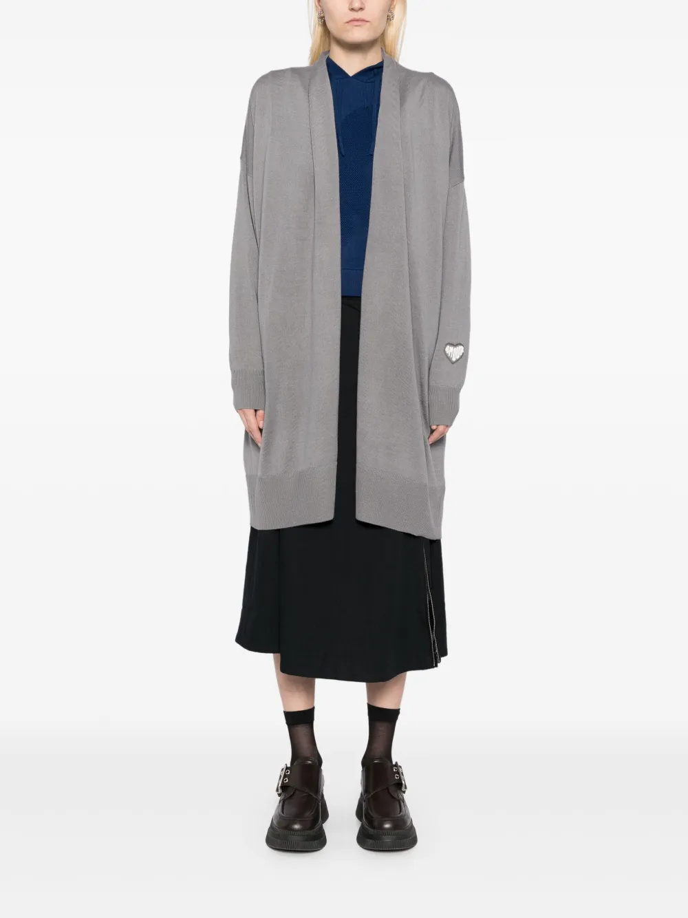 lichtgrijs wolblend gebreid geborduurd patroon twee ingenaaide zijzakken lange mouwen sjaalkraag geribbelde manchetten en zoom