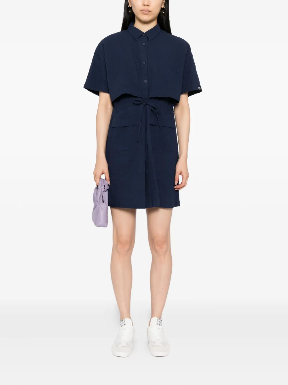 donkerblauw knoopsluiting aan de voorkant elastische tailleband met trekkoord korte mouwen twee klepzakken aan de voorkant