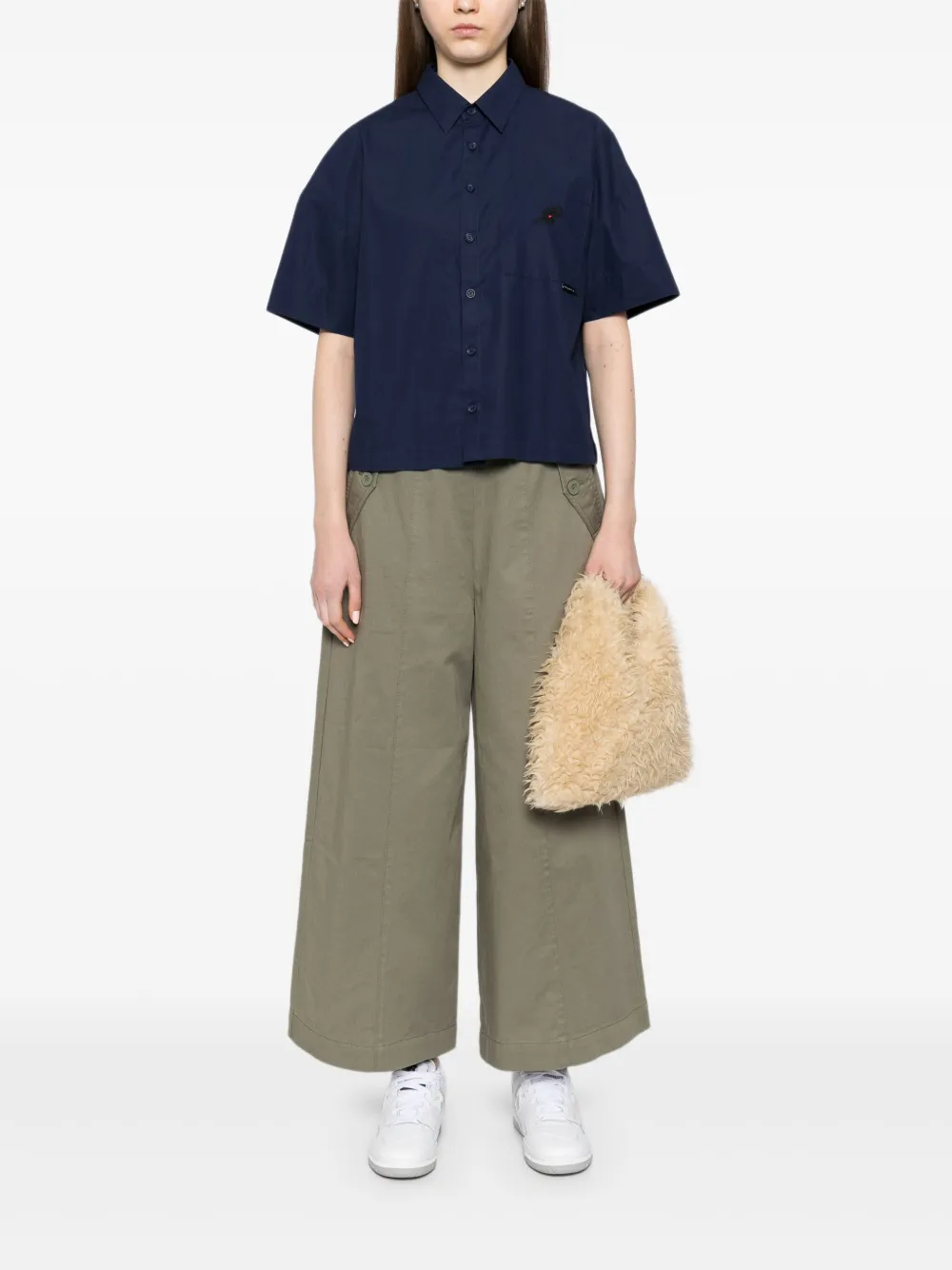 olijfgroen katoen detail met verschillende vlakken mini logo label knoop- en ritssluiting aan de zijkant twee klepzakken aan de zijkant twee steekzakken aan de zijkant wijde pijpen