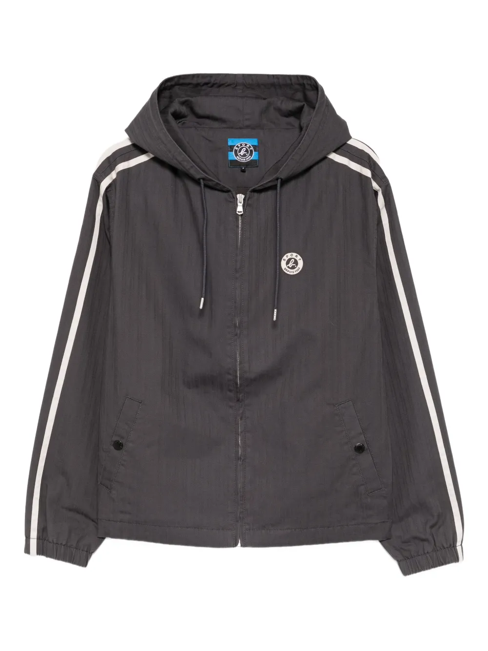 gris foncé fermeture zippée devant capuche à lien de resserrage deux poches passepoilées boutonnées sur le devant